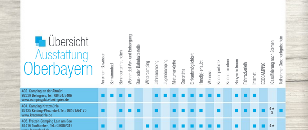 Auf einigen der insgesamt 60 Seiten werden viele Campingplätze mit Bild und einer kurzen Selbstbeschreibung hervorgehoben, zu keinem dieser Beiträge wird angegeben ob hier Barrierefreiheit vorliegt.