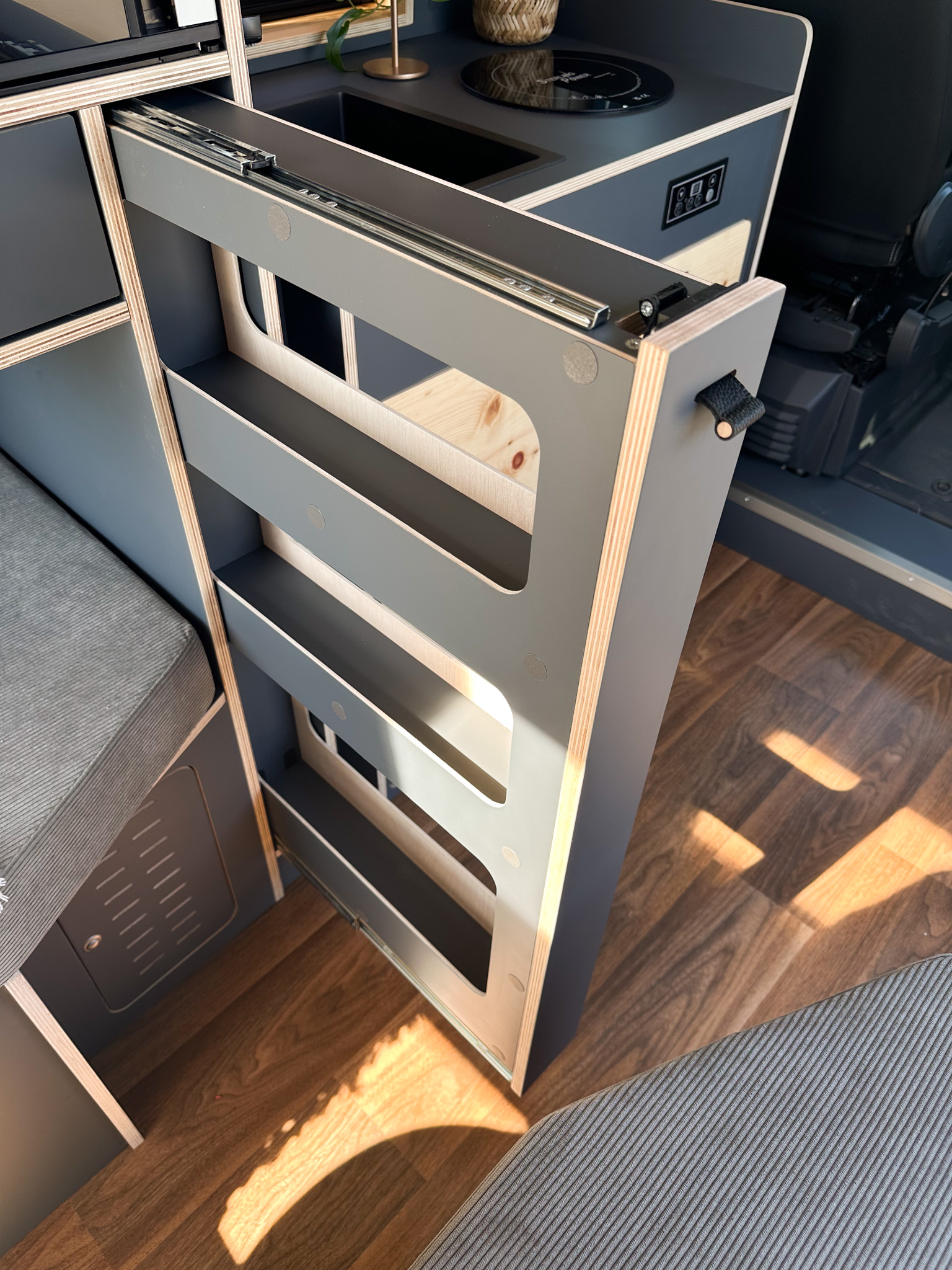 Also: weg vom klassischen Küchenkonzept im barrierefreien Wohnmobil, geschnibbelt und gekocht und gegessen wird drinnen im Sitzen, und das auch nur wenn es regnet!