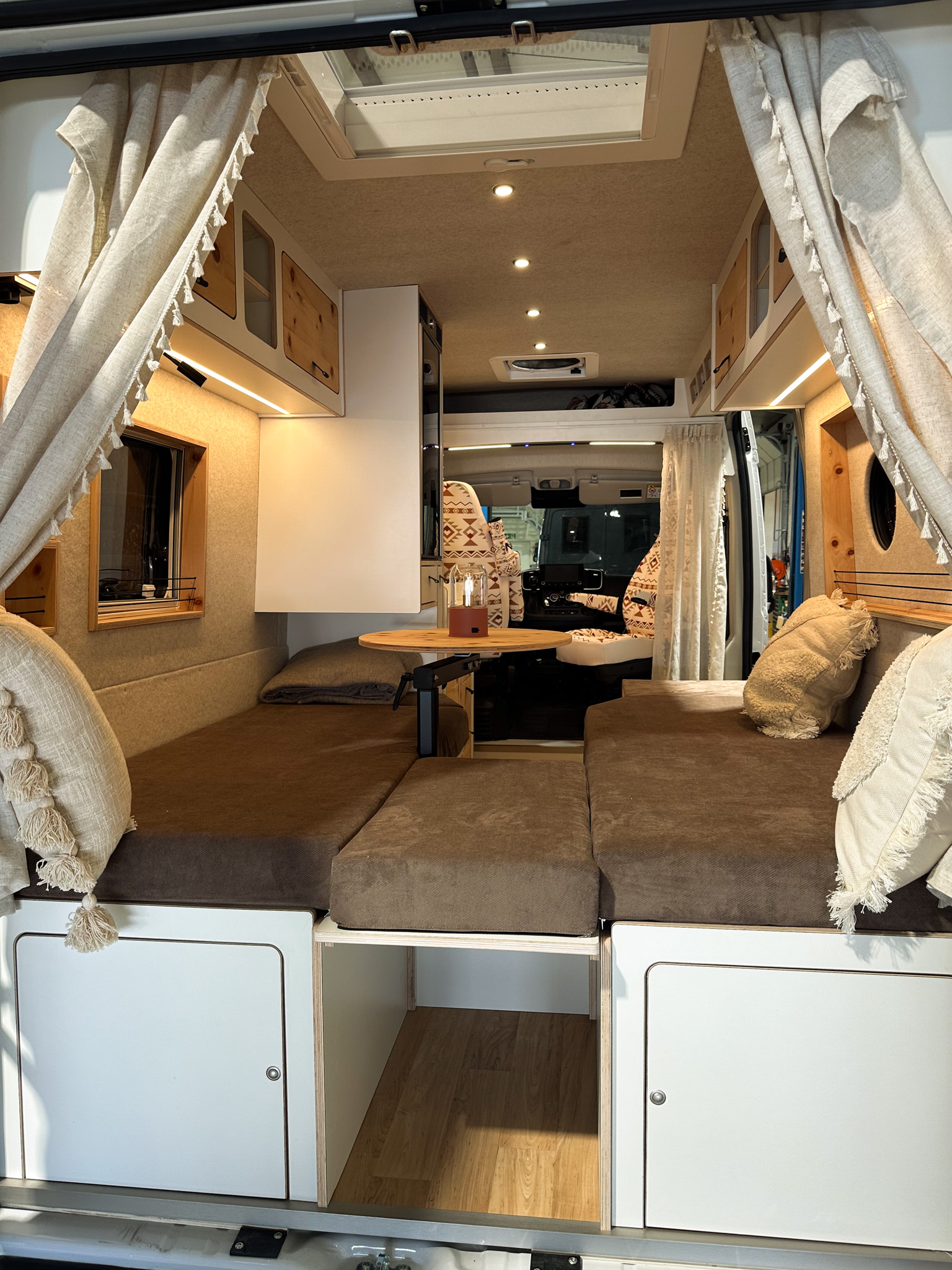 Alles auf 5,40 m – wir verfolgen das Konzept barrierefreier Camper und Alltagsauto. Also heißt es „Reduzieren auf das Maximale“: Dinge müssen mehrfach nutzbar sein, Ein- oder Ausklappen wenn möglich, Stauraum verbleibt begrenzt.