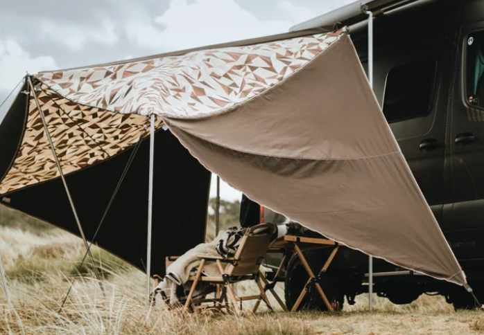 Privatsphäre im Außenbereich gewähren bspw. die Bent Vorzelt Dreiecke , die wasserdicht am Camper und in beliebiger Kombination aufgestellt werden können.