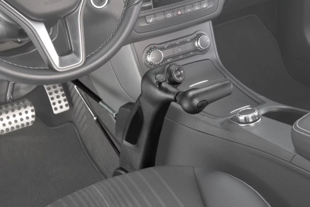 Umrüstung auf Handgas: das Fahrzeug erhält eine manuelle Handgas Umrüstung. Manuell bedeutet, das Bremse und Gas über ein Stangensystem mit einem Hebel verbunden sind. Nach vorne bewegt wird gebremst; zurück wird beschleunigt. Am Lenkrad wird ein Knauf angebracht wie ihn auch LKW Fahrer nutzen.