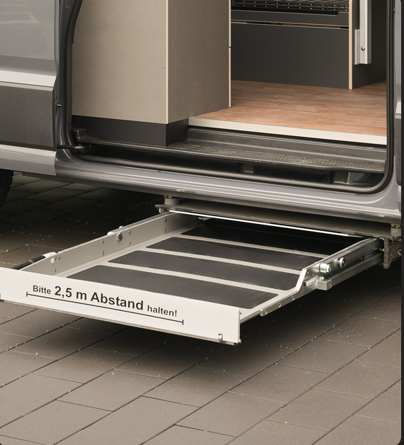 Einstieg des Campers mit Einschränkungen in der Mobilität erfolgt barrierefrei über die Schiebetür. Es ließe sich auch ein barrierefreier Einstig direkt in die Fahrererkabine einrichten.