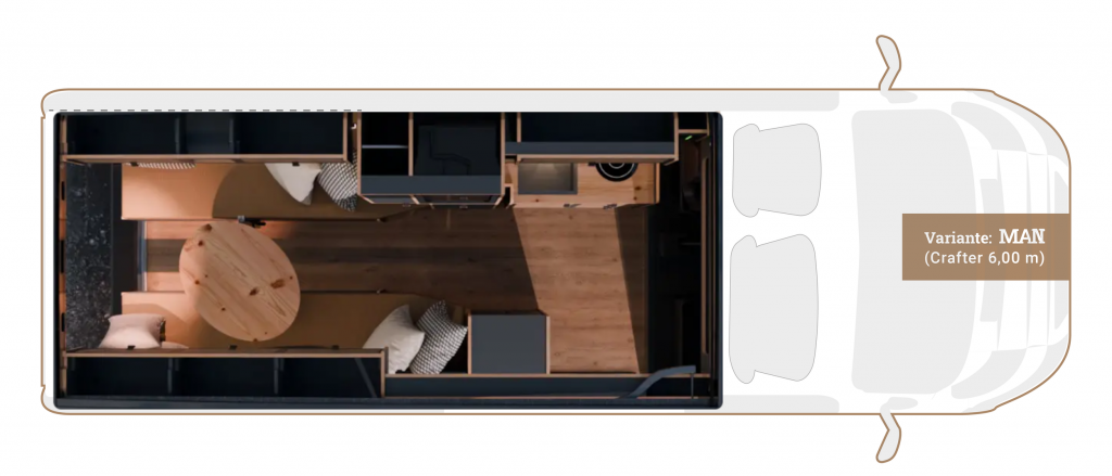 Show Car – Barrierefreier Camper Van wird ausgelegt für 2 Personen: eine Person mit Einschränkung in der Mobilität (dem unterschiedlichen Grad der Einschränkung wird im Ausbau Rechnung getragen) und einer Begleitperson, die dem Betroffenen leichte Unterstützung (Umsetzen, Schieben) bieten kann.