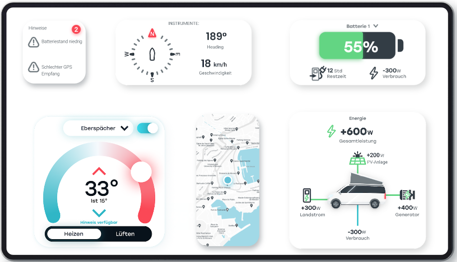 Licht, Heizung, Wasserheizung, Füllstandsanzeigen, Musik, Kühlschrank, Energiemanagement, sofern möglich die Bettsteuerung, Außenbeleuchtung, einfach alles was ein Bedienfeld mit bringt soll in eine zentrale Steuerung integriert werden. Dieses zentrale Management wird über ein Bedienfeld gesteuert das am Schrank angebracht ist in dem sich der Kühlschrank befindet. Zusätzlich wird die Steuerung über ein Tablett oder Smartphone möglich sein.